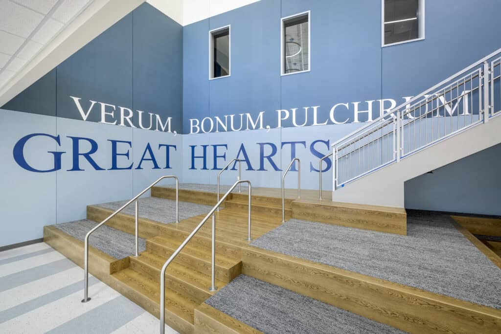 This modern 77,000-square-foot school features tilt-wall concrete panels with a brick-embossed exterior. The campus includes classrooms, a full-size gymnasium, cafeteria, and a regulation soccer field—designed to support both learning and recreation.