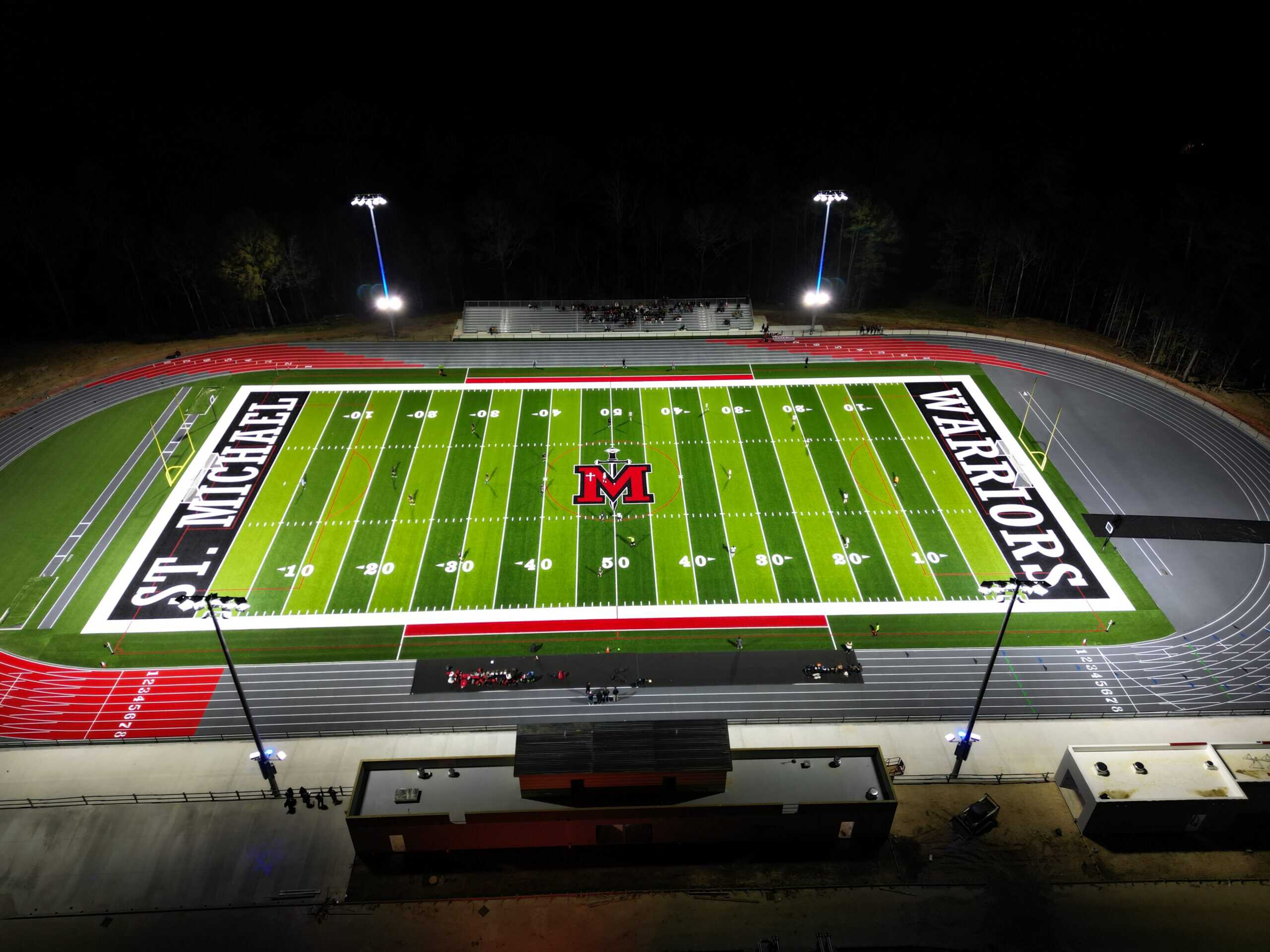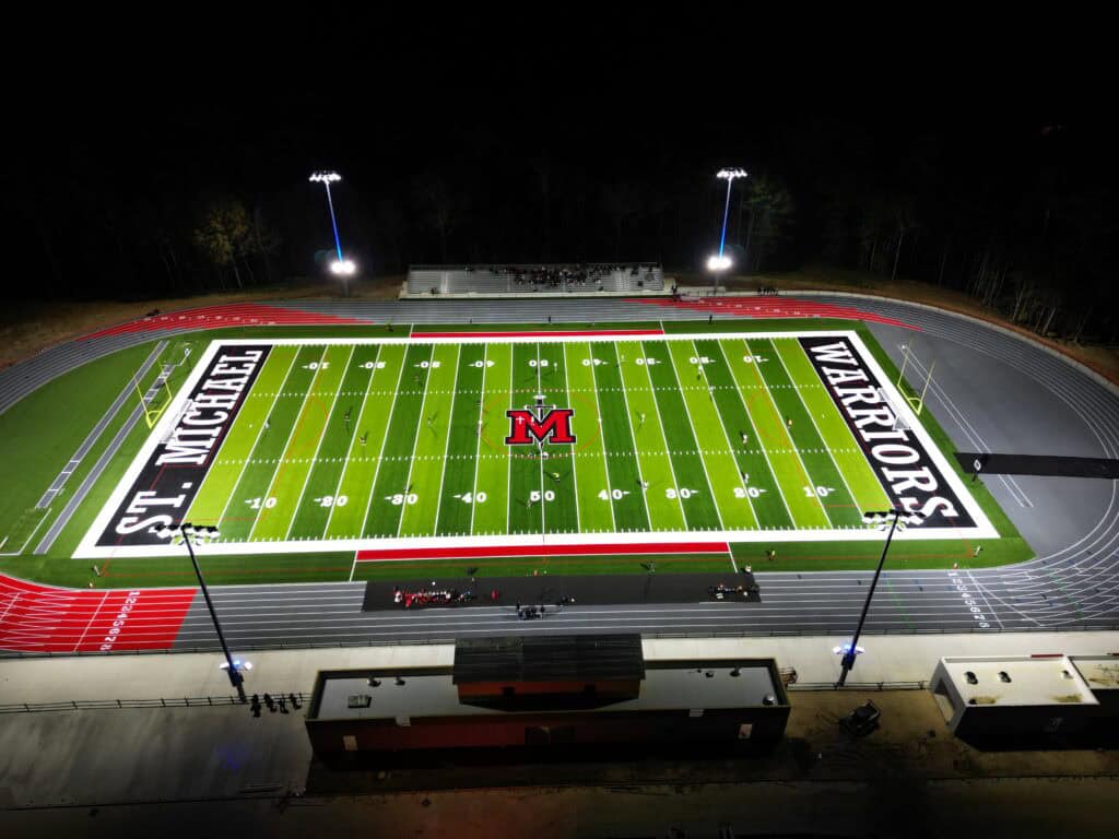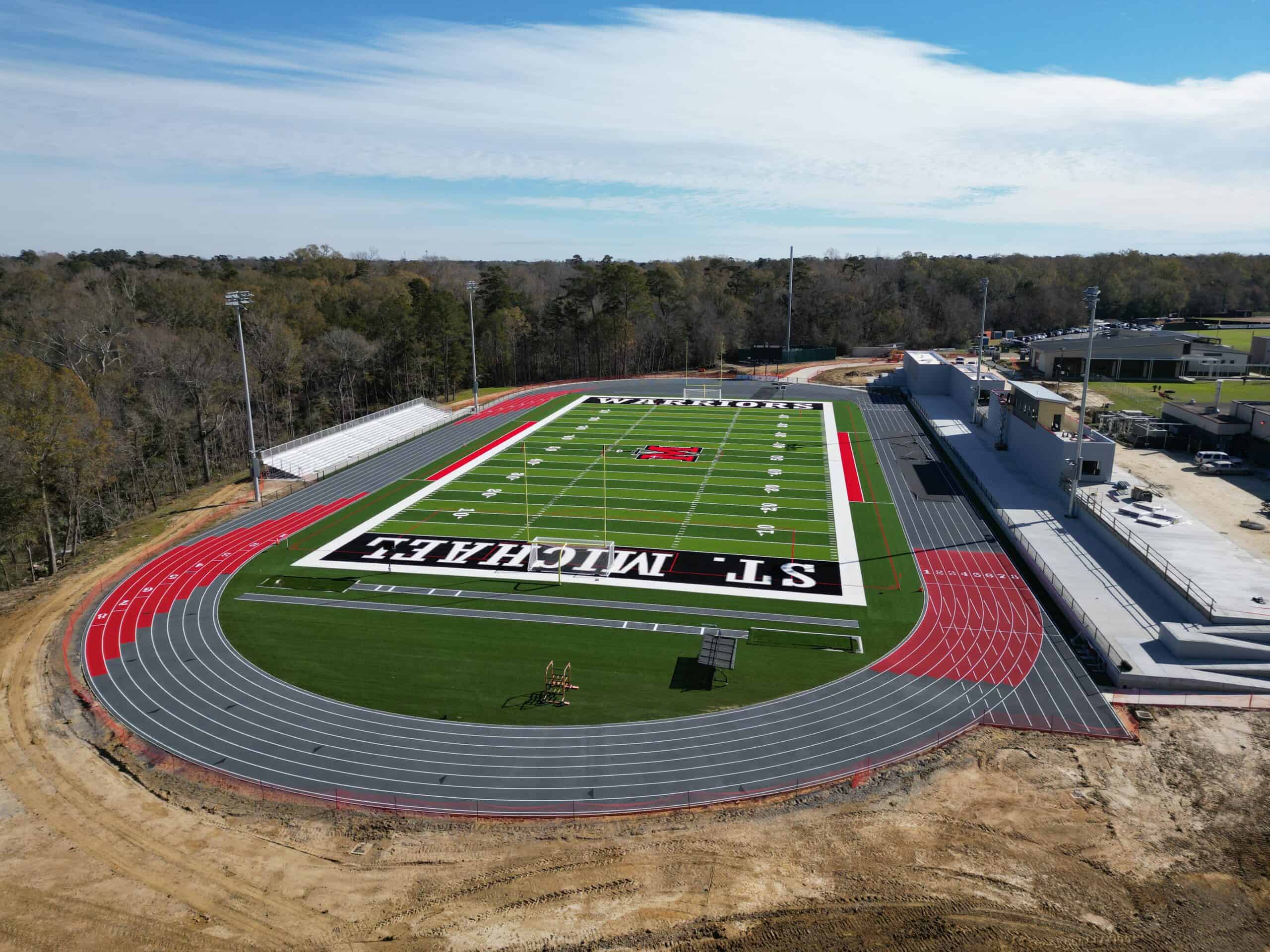 This project consisted of a new turf sports field and running track including subsurface and drainage improvements, LED field lighting, new bleachers on the home & visitors sides, and additional buildings. The additional buildings included a Press Box, Locker Rooms, Restrooms, Concessions, and Storage Rooms. This project also consisted of additional parking and circulation road.